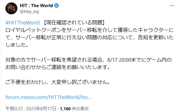・8/17 0:30告知更新までにアイテムを受取り、サーバー移転を正常に行えないキャラクター