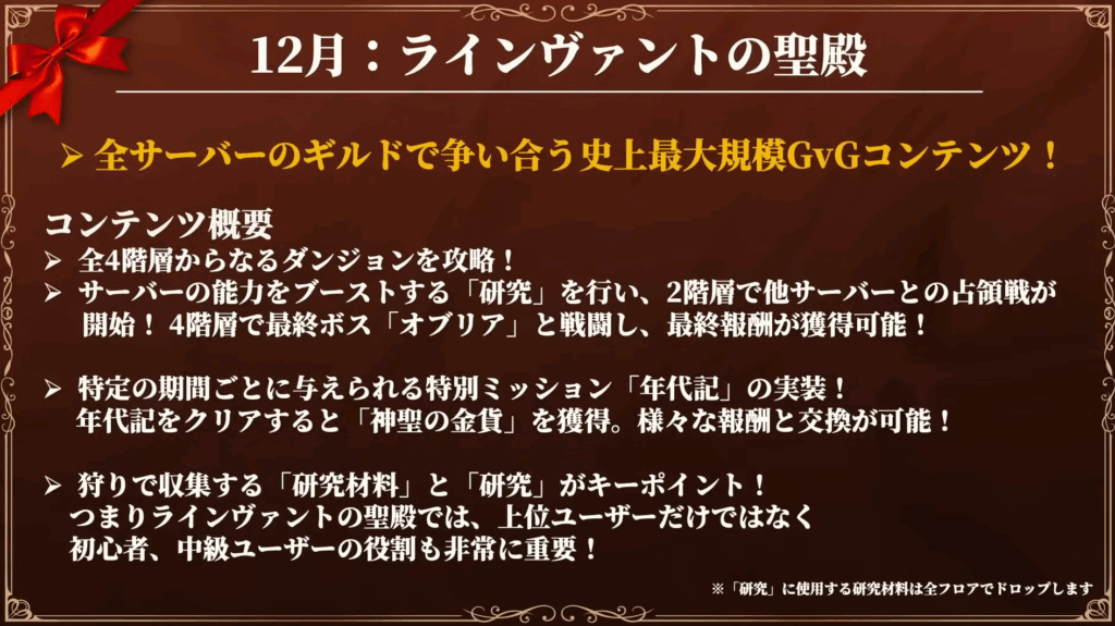 - 12月:最大横断GvGコンテンツ「ラインヴァントの聖殿」実装