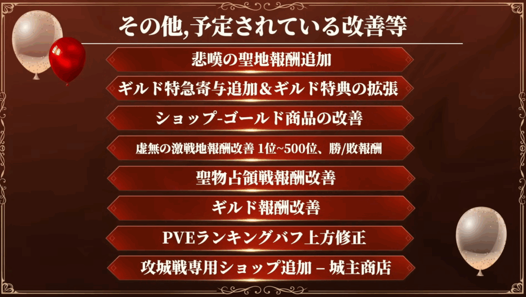 クラス変更、ドロップ率、初心者・ギルドボス調整など各種改善を予定。