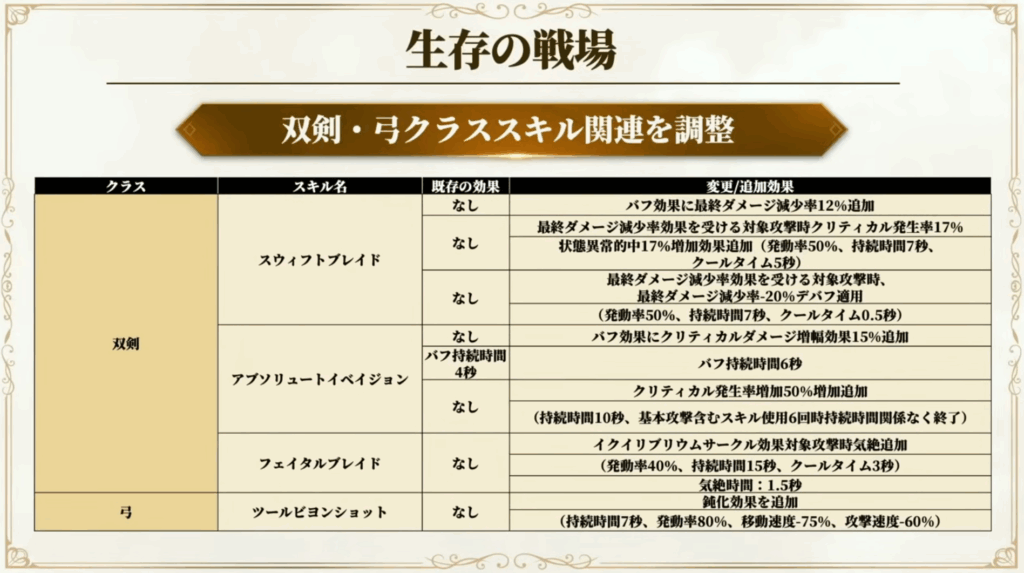 - 双剣:妨害パッシブ強化、クリティカル率向上。ただしパーティバフの削除が検討中。