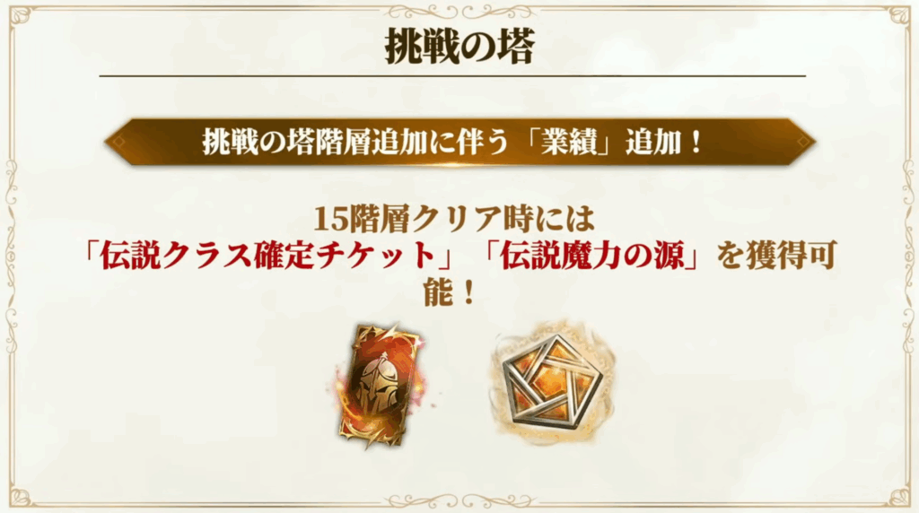 - 階層が15階まで追加。クリア報酬には「伝説クラスチケット」「伝説魔力の源」が登場。