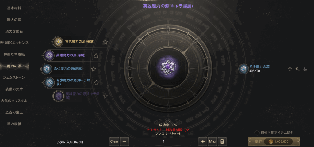 製作(魔力の源や装備の欠片)