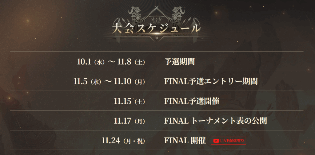 11.15(土)に行われる、決勝トーナメント出場権をかけた「FINAL予選」に参加するギルドとして申請を行う期間です。