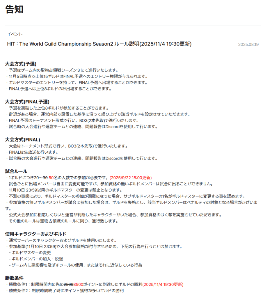 重要なのはFINAL予選エントリーは、11月8日時点で15位のギルドのみが申請できます。
