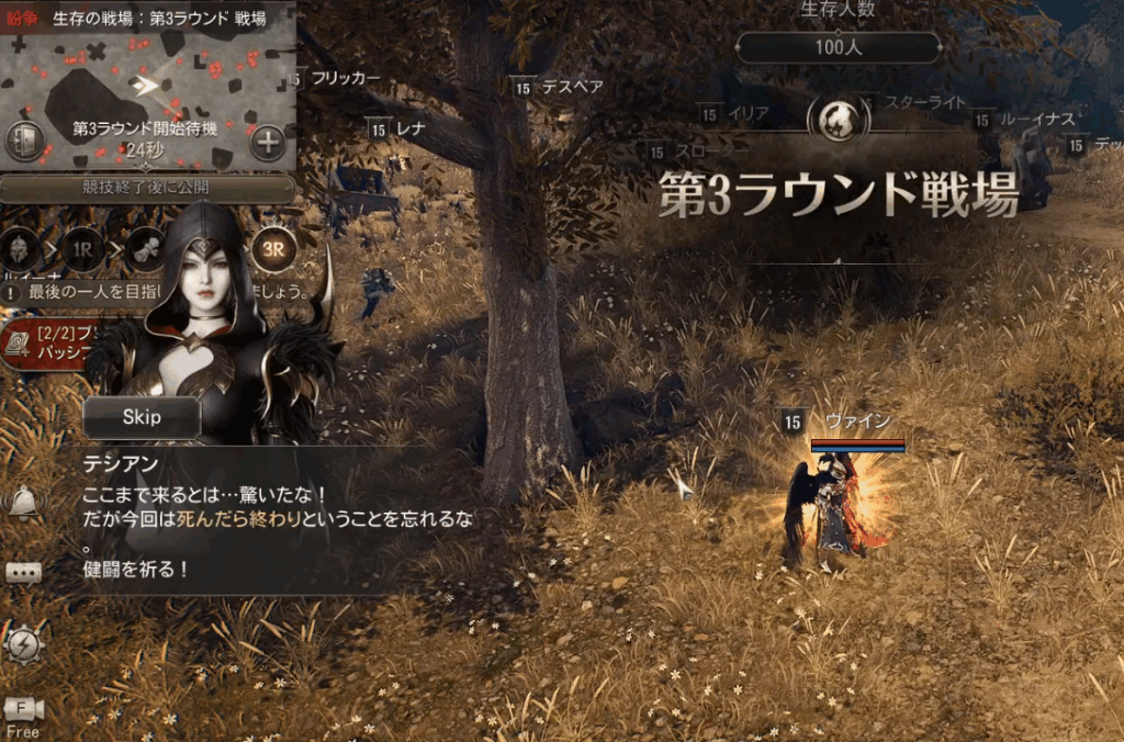 生存の戦場の第3ラウンド戦場の開始時、ここまで導いてくれたテシアンさんがプレイヤーに投げかける言葉の中で「文字色が違う」部分があります。