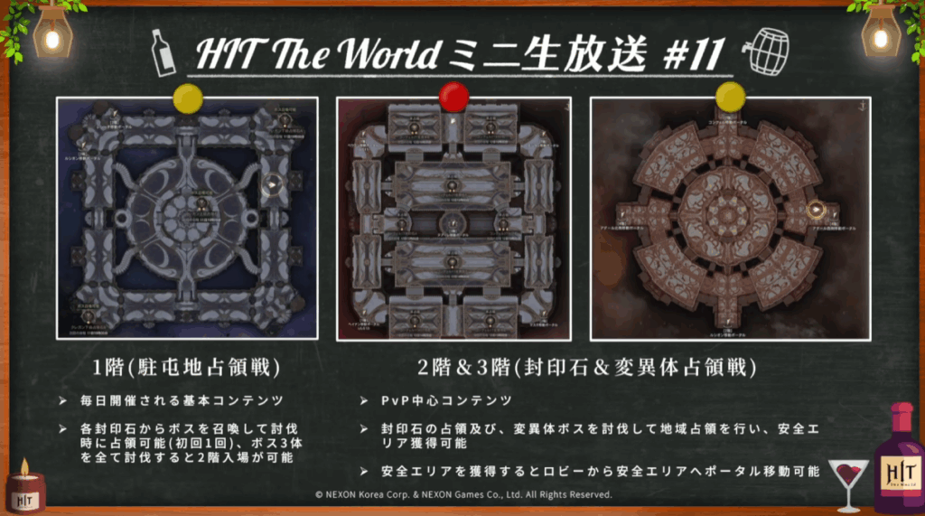 2階&3階…PvP中心コンテンツ、刻印石の占領およびボス討伐で特定エリアを占領でき、安全エリアを確保できる。