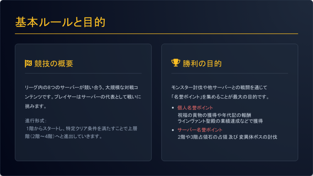今回のラインヴァントの聖殿では2つのリーグに分かれて、1つのリーグにつき8つのサーバーが覇権を争います!