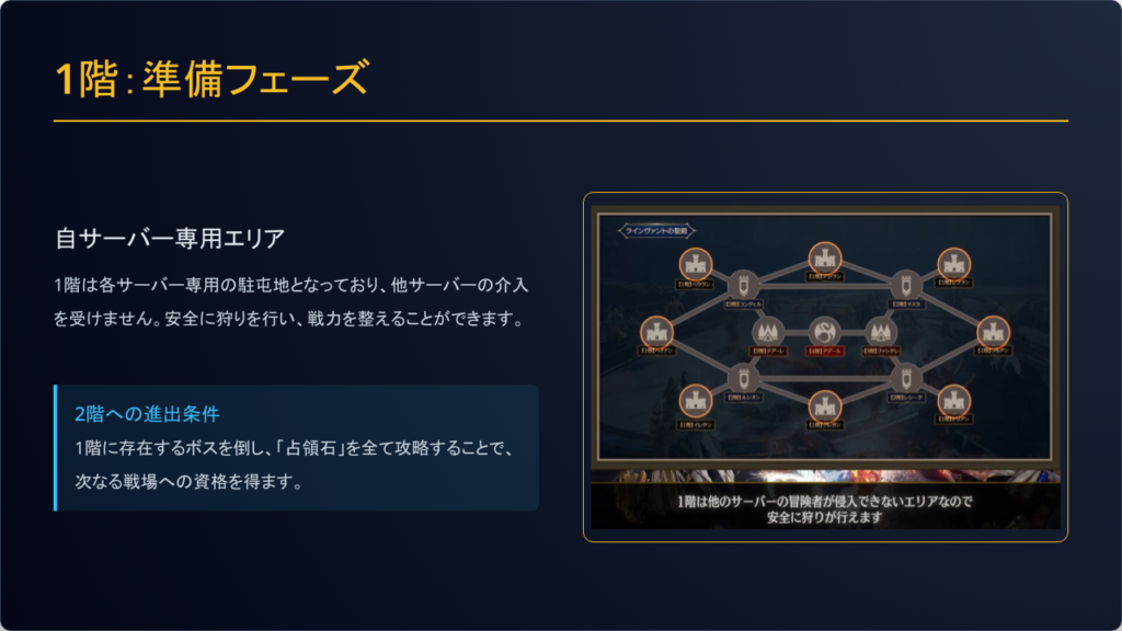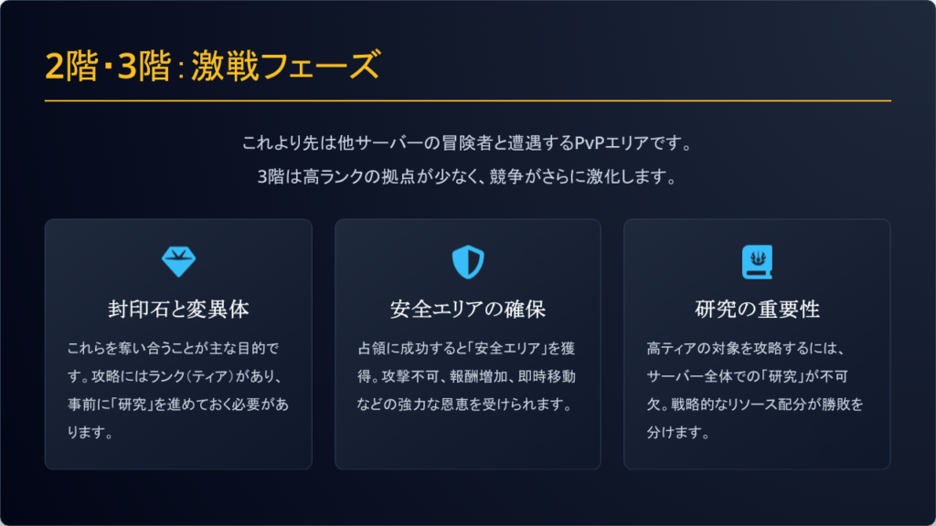 2階と3階はPvPが中心の場所となっており、刻印石の占領およびボスの討伐で「特定エリアを占領」でき、安全エリアを作ることが可能です。