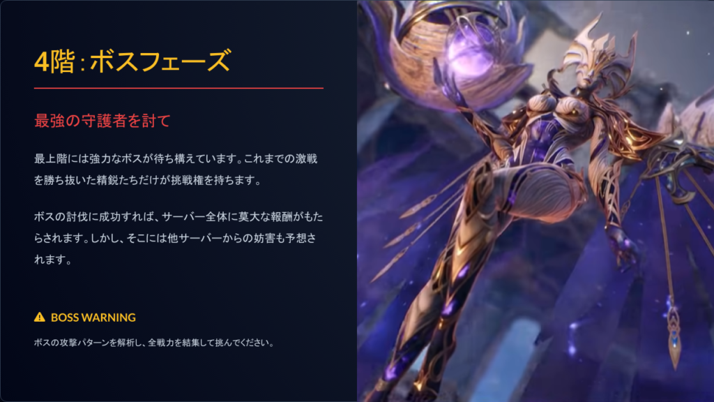 全サーバーのプレイヤーが集結するエリアでもあるため、ボスだけでなくプレイヤーとの戦いも発生することから、ここまでに至るまでにどれだけ道中で「研究」を進めてサーバーを有利にできるかが重要です。