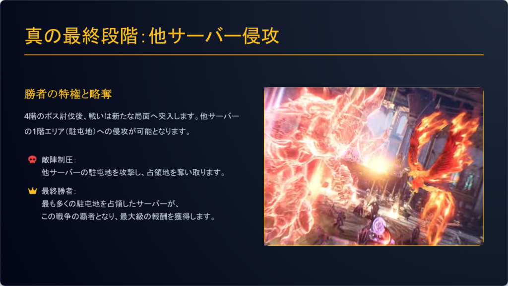 ボスを討伐後はこれまで安全地帯だった各サーバーの駐屯地が解放されます。