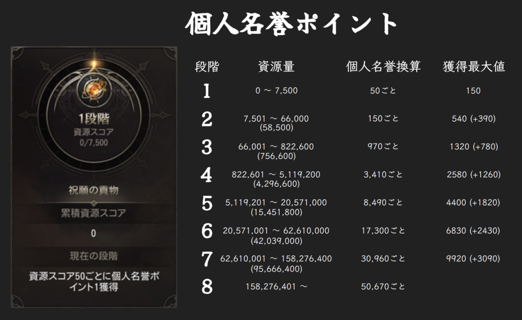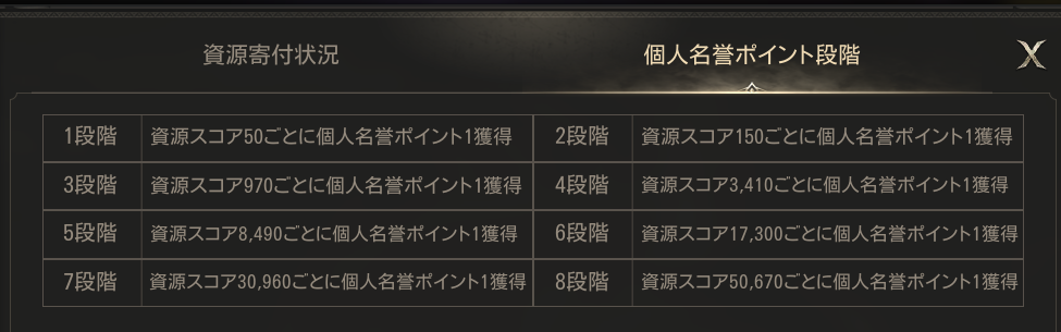 このように段階に応じた資源コストごとの個人名誉ポイントがわかります!