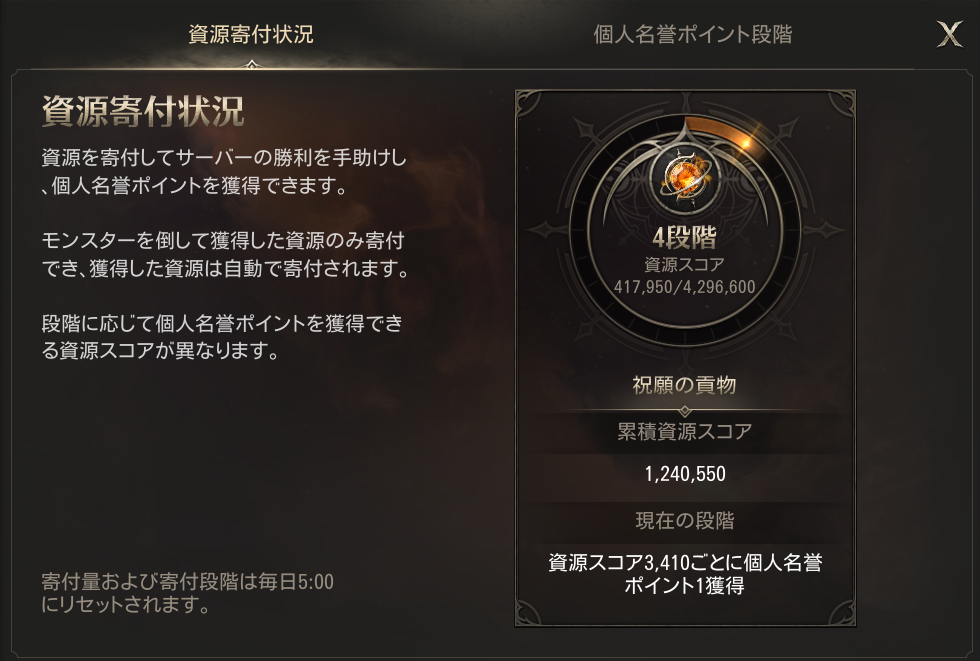 段階が1段階目の時は祝願の貢物を50ポイント獲得したら個人名誉ポイントが1増えていましたが