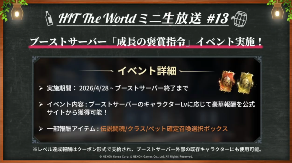前回もあったブーストサーバーキャラのレベルに応じた豪華報酬です。