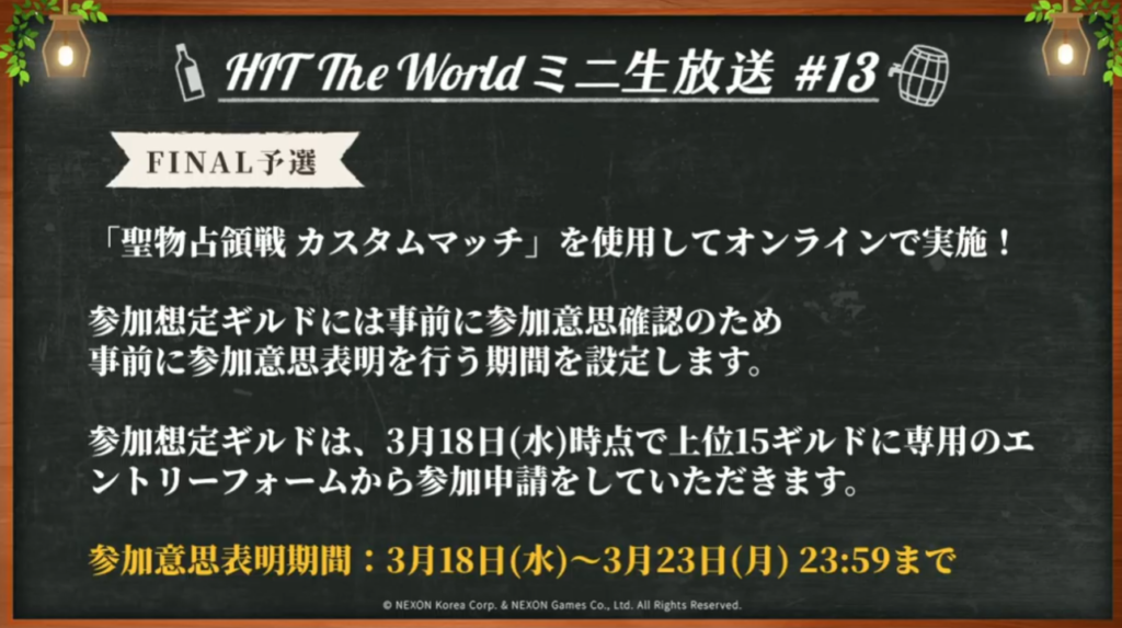 最終予選は予選の上位15ギルドから「事前応募」という形になるので