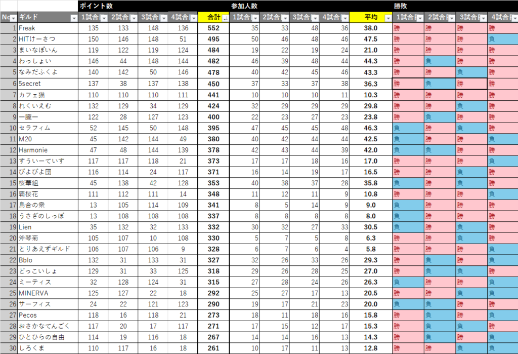 | No. | ギルド | 1試合目 | 2試合目 | 3試合目 | 4試合目 | 合計 | 1試合目 | 2試合目 | 3試合目 | 4試合目 | 平均 | 1試合目 | 2試合目 | 3試合目 | 4試合目 |