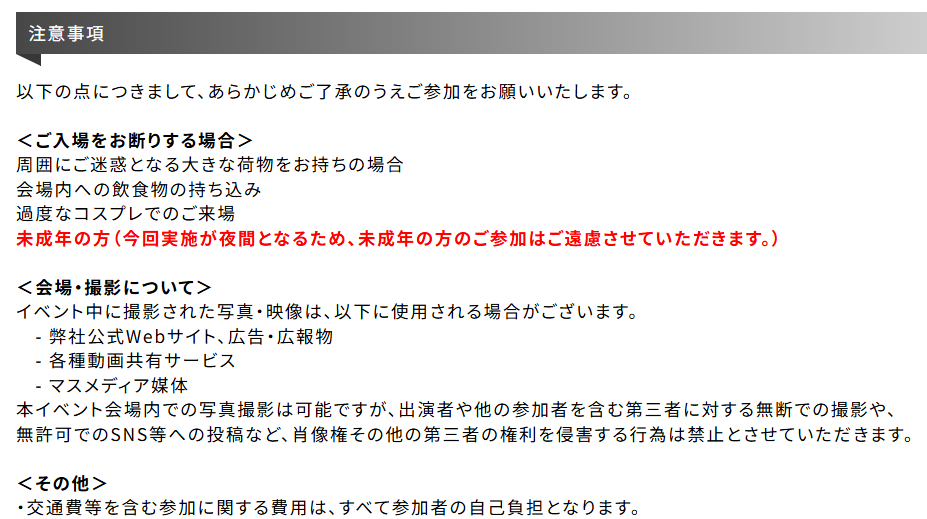過度なコスプレ、飲食物の持ち込みは特に注意してください!